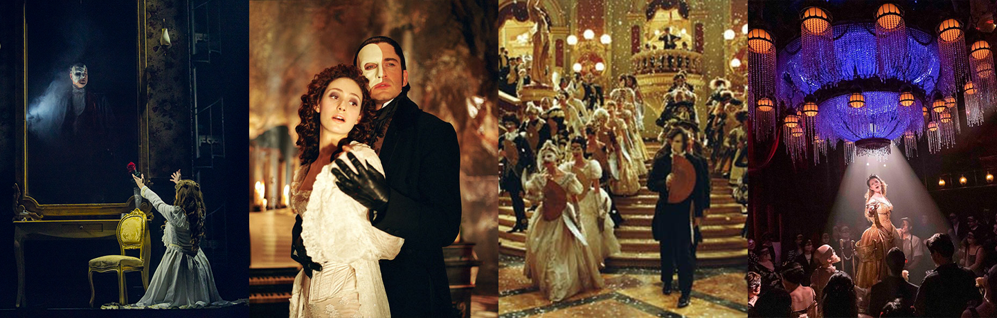 Collage composed of materials from different adaptations of The Phantom of the Opera. Each image remains the property of its legal owners. From left to right: LETSGO musical production; Joel Schumacher movie (2004) and Masquerade the immersive production.