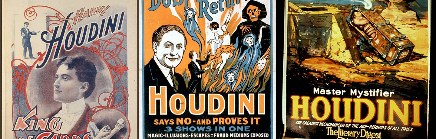 Collage de imágenes promocionales de Harry Houdini entre finales del siglo XIX y comienzos del XX, incluyendo King of Cards (1895), Houdini as Ghostbuster y Master Mystifier. Archivo histórico.